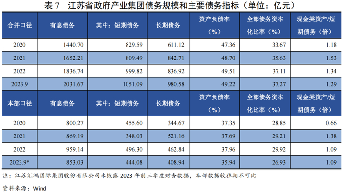 2020-2022年末和2023年9月末,江苏省政府产业集团资产稳步积累,负债规模增速高于资产增速,杠杆水平有所提升,债务负担整体可控;债务期限整体偏短期,但合并及本部层面现金类资产均可以对短期债务形成保障,且考虑到省属产业集团本部直接持有的上市公司股权大部分未用于质押,可对财务弹性形成支撑,整体偿债风险可控。