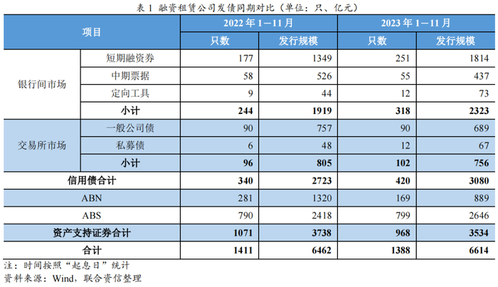 2023年1-11月,融资租赁公司债券发行规模同比微幅增长,其中信用债发行规模同比增长,而资产支持证券发行规模同比下降;信用债以公募产品为主、发行期限整体偏短,资产支持证券以交易所市场发行的ABS为主,整体融资情况稳定。