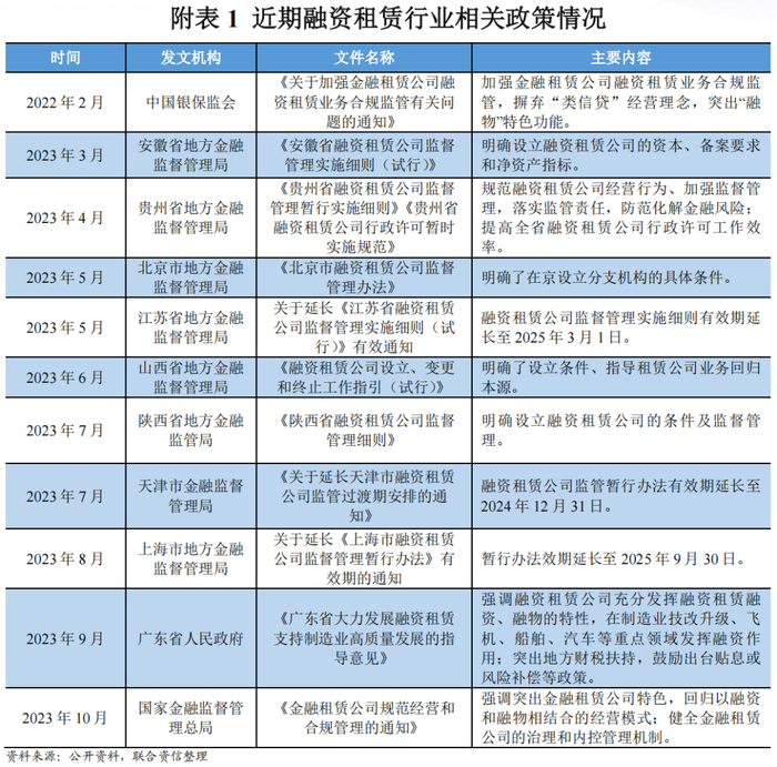 2023年,针对部分金融租赁公司偏离融物本源问题,国家金融监督管理总局下发了金融租赁公司管理办法,强调金融租赁公司回归“融资融物”的经营模式,暂未有针对融资租赁公司的具体文件下发;新增贵州省、北京市、山西省和陕西省等地方金融监督管理局发布融资租赁业务指引及实施细则,主要目的以规范地方金融组织及其活动,防范、化解与处置金融风险为主,对融资租赁公司的设立要求更加严格,业务范围界定更加清晰,监督管理力度更大;融资租赁公司所在地较多的天津、江苏和上海等地区延长了融资租赁公司监督管理办法实施的过渡期。