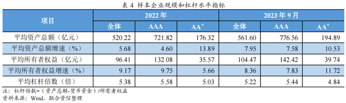 截至2023年9月末,样本企业平均资产总额保持增长,较上年末增长7.95%,增速较2022年有所提升;其中AAA样本企业较上年末增长7.58%、AA+样本企业较上年末增长10.53%,AAA样本企业增速较2022年有所提升,而AA+样本企业增速较2022年有所下降。