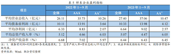 2023年1-9月,样本企业平均营业总收入、拨备前利润和净利润较上年同期均保持增长。2023年1-9月,样本企业平均营业总收入同比增长4.96%,其中AAA样本企业同比增长3.73%、AA+样本企业同比增长11.99%;样本企业平均拨备前利润同比增长2.19%,其中AAA样本企业同比增长0.49%、AA+样本企业同比增长13.29%;样本企业平均净利润同比增长4.76%,其中AAA样本企业同比增长2.12%、AA+样本企业同比增长23.97%。从盈利规模指标来看,AA+样本企业增速均显著高于AAA样本企业,主要由于:AA+样本企业平均营业总收入增长金额略低于AAA样本企业、平均拨备前利润和平均净利润增长金额均高于AAA样本企业,加之AA+样本企业基数较小所致,我们也关注到AA+样本企业平均减值损失计提规模小于AAA样本企业。