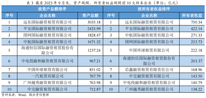 本文选取了截至2023年11月末有存续公募信用债且披露2023年三季报的46家融资租赁公司作为样本公司以观察其财务表现情况,其中AAA样本主体29家、AA+样本主体17家、无AA样本主体。截至2023年9月末,资产总额和所有者权益前十大的样本企业如表3所示。