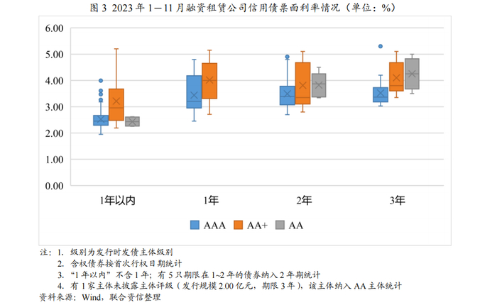 信用债发行票面利率方面,2023年1-11月,发行期限1年以内的债券,AAA主体票面利率区间相对集中,中位数为2.45%,但有部分离群值,主要来自于某头部公司发行的短期融资券;AA+主体票面利率区间相对分散,中位数为2.96%;仅有一家AA主体发行债券且期限在60天~120天,可比较性较差。1年期债券(含权债券按首次行权日作为到期日进行统计,下同),AAA主体票面利率中位数为3.20%,AA+主体票面利率中位数为4.00%,AAA主体资金成本优势较为明显。2年期债券,AAA主体票面利率中位数为3.39%,AA+主体票面利率中位数为3.35%,AA主体票面利率中位数为3.87%;AA+主体票面利率中位数较低主要由于发行期数较少且某产业类租赁公司发行了4期票面利率较低的绿色债券。3年期债券,AAA主体票面利率中位数为3.37%,AA+主体票面利率中位数为3.80%,AA主体票面利率中位数为4.25%(全部含有AAA增信),较为公允的反映了信用利差。