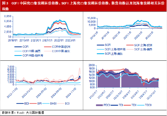 CCFI以及SCFI指数等指标作为航运业的重要参考信息,一定程度上能反映港口行业面临的船公司的供需现状。进入2023年后,CCFI以及SCFI指数整体均进入低谷,疫情期间国际远洋行情下多次出现集装箱一箱难求等情况,指示航运价格大幅抬升,随着供需平衡的变化以及疫情影响的消失,可见相关运价在2023年整体处于回落并缓慢下降的趋势。而在散货方面,2023年全年表现波动很大,由年初于1250点附近持续下降至2月中旬最低530点位,而后迅速拉升至4月中旬,而后在波动中继续逐渐回落至1000点附近,于9月后快速涨至高位且波动很大;而在内贸集运方面,从年初开始整体呈现下降趋势而后略有回升,但整体较年初仍处于较低水平。对比相关数据,我们可以从一定程度上发现今年宁波舟山港和上海港货物吞吐量和集装箱吞吐量的趋势变化的原因,尤其是散货的指数表现和港口吞吐量的数据趋同性更高。