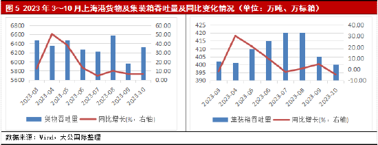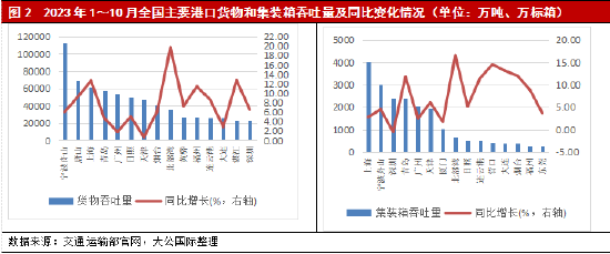 2023年1~10月,宁波舟山港和上海港仍分别居我国港口货物吞吐量和集装箱吞吐量首位;两港2023年3~10月吞吐量变化趋势一定程度上体现出基于去年同期低基数的恢复性增长,其中宁波舟山港在9月份的整体表现较为亮眼,但在10月迅速回落。