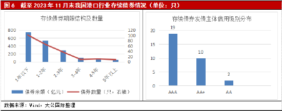 信用质量:我国港口企业融资渠道较为通畅,整体偿债能力较强,发债主体集中度较高,主体信用级别较高,信用质量较好。预计2024年,港口企业偿债能力仍较强,短期债务到期较为集中,但到期债务规模相对债券存量市场规模很小,发债主体仍较为集中,需关注部分资产盈利实力较小的企业的经营和融资渠道变化。