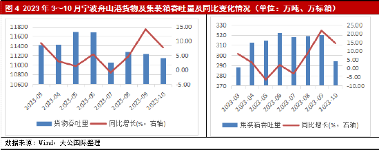 2023年3~6月和8~10月,宁波舟山港货物吞吐量同比均为正增长,2023年7月,宁波舟山港货物吞吐量同比下降0.96%。2023年3~10月宁波舟山港累计实现货物吞吐量9.09亿吨,恢复性增长5.33%。2023年5月、7月,宁波舟山港集装箱吞吐量同比分别下降6.53%和3.05%,3~4月、6月和8~10月,宁波舟山港集装箱吞吐量同比正增长。2023年3~10月累计实现集装箱吞吐量2,489万标箱,同比增长5.29%。