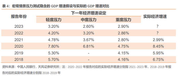 逻辑上压力情景对GDP的设定值,一定程度上体现了央行对于对应年份经济增长的预期。将历年报告中压力情景设定值与全年实际经济增速作对比,总体来看假设值和实际值差别不大。