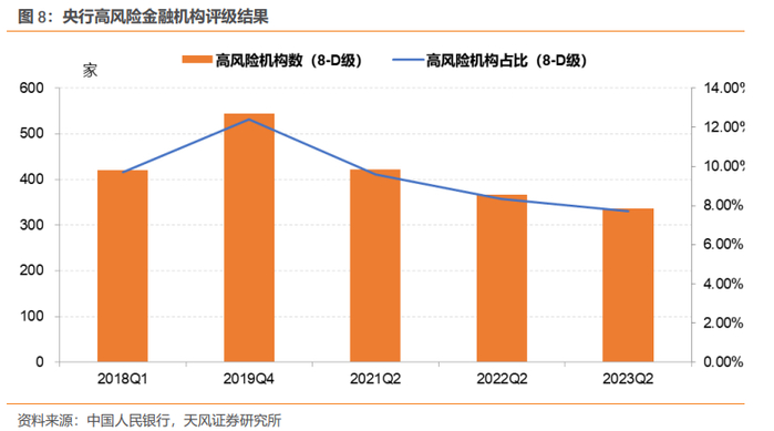 高风险机构数量下降。观察本次结果,高风险机构(8-D级)共337家,较上次评级减少29家,数量占比7.72%,资产规模占比1.72%。2018年Q1以来,央行总共进行了5次金融机构评级,其中2018Q1、2019Q4、2021Q2和2022Q2四次评级,高风险机构数分别为420家、545家、422和366家,数量占比分别为9.71%、12.39%、9.59%和8.33%。