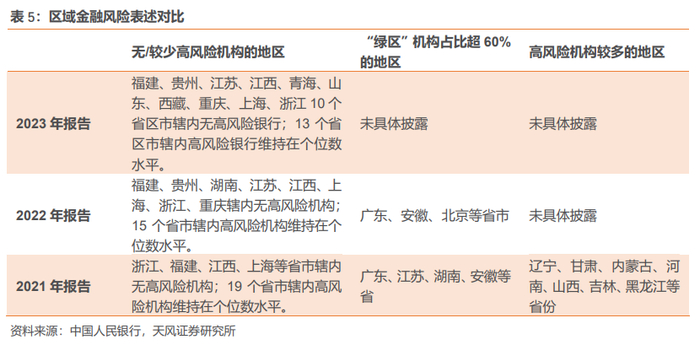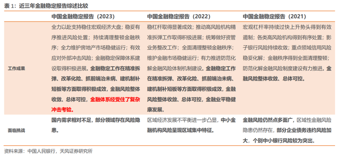 2022报告指出,“中小金融机构风险呈现区域集中特征”;2023报告措辞调整为,“金融稳定工作取得积极成效,金融体系经受住了复杂冲击考验”。措辞变化,反映出中小金融机构风险化解工作逐步推进,当前风险总体可控。