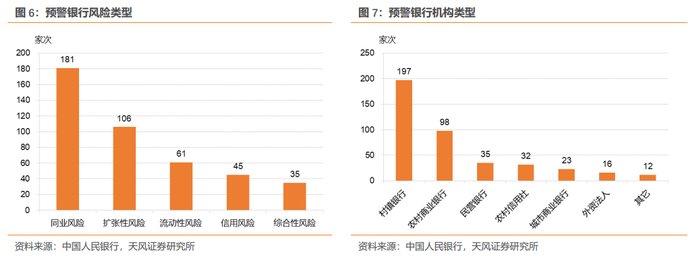 从触发预警的风险类型角度,以同业风险和扩张性风险为主,上述二者合计286家次,占比69%。从触发预警的机构类型角度,以村镇银行和农村商业银行为主,上述二者合计295家次,占比为71%。