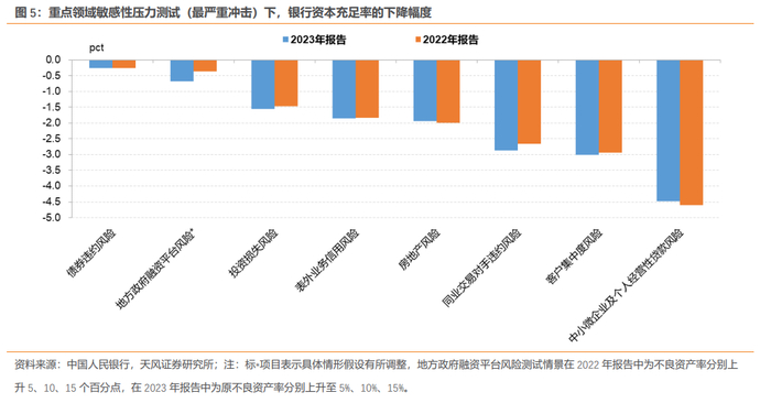 2022年报告中,测试表明若对地方政府融资平台融出资金的不良资产率上升15个百分点,则整体资本充足率下降至14.67%,下降0.27个百分点。2023年报告中,测试表明若地方政府融资平台不良资产率上升至15%(原基准不良资产率必然不小于0,说明测试情景比2022年报告有所放松),则整体资本充足率下降14.38%,下降0.69个百分点(冲击幅度反而上升)。