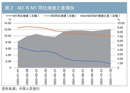 自2023年1月以来,狭义货币供应量(M1)同比增速持续走低,从年初的6.7%降至11月的1.3%。广义货币供应量(M2)增速维持高位。但自年初以来衡量货币流通速度的GDP/M2同比变动处于低位,资金活跃度不足。与此同时,M2与M1增速之差增加(见图2)。企业端活期存款增速下降成为M1同比增速最大拖累项:一方面,房地产市场遇冷,阻碍居民储蓄向企业活期存款的转换;另一方面,企业端短期内投资扩张意愿较弱,且在经营面临压力的情况下资金多用于偿还利息。