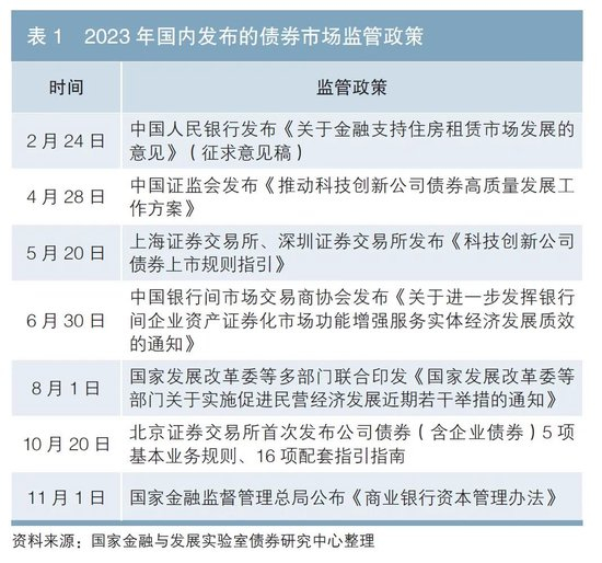 2023年3月,第十四届全国人民代表大会第一次会议表决通过了关于国务院机构改革方案的决定,成立了国家金融监督管理总局。在此次金融监管改革中,原由国家发展改革委监管的企业债券改为由中国证监会监管。2023年以来,与债券市场相关的政策法规密集出台(见表1),不断促进投融资信心恢复,支持经济企稳增长。