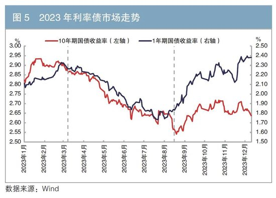2023年,债市整体呈现牛市行情,全年10年期国债收益率下行约28BP。下行期间市场有一定波动和交易逻辑的转换(见图5)。