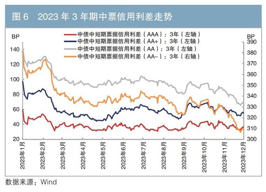 2023年,信用债整体表现好于利率债,其走势受到无风险利率的影响,与利率债走势有所差异。以3年期中票为例,从信用利差来看,信用债行情大致可以划分为6个阶段(见图6)。
