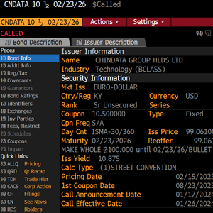 来自中国的数据中心运营商秦淮数据在今年1月26日执行了债券的Make-whole Call条款,提前2年1个月赎回26年到期的美元债CNDATA 10 ½ 02/23/26 Corp,赎回价格110.04元。