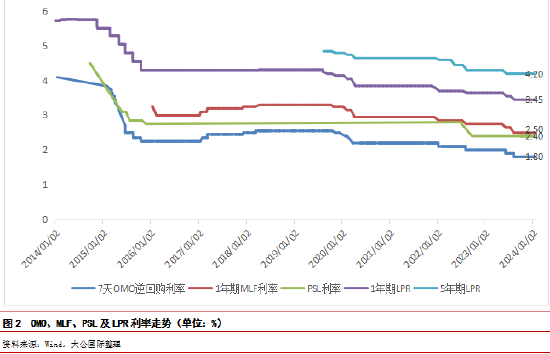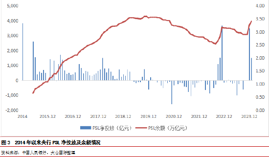 从PSL功能属性来看,PSL作为基础货币的投放渠道,具有宽货币属性,同时,PSL对国民经济重点领域、薄弱环节和社会事业发展进行定向宽松,兼具类财政属性。从利率角度来看,PSL利率自创设以来一直呈下行趋势,由最初4.5%降至2.4%,2023年9月末,PSL利率较1年期MLF利率低10bp,较1年期LPR低105bp,较5年期LPR低180bp,成本优势明显。