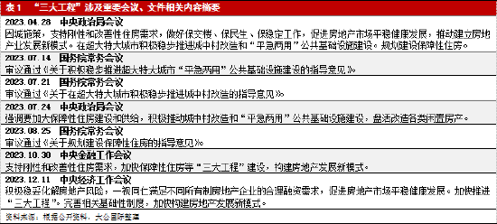 2023年以来,中央多次重要会议均提及加快“三大工程”建设。“三大工程”是根据房地产市场新形势推出的重要举措,是落实房地产发展新模式的重要抓手,也是稳定房地产市场的长效机制和重要切入点。年底召开的中央经济工作会议指出,加快推进保障性住房、“平急两用”公共基础设施、城中村改造等“三大工程”建设。近期,央行行长潘功胜在多个场合提到要为“三大工程”建设提供中长期低成本资金支持。根据前述PSL功能属性及历史投向,结合2023年以来政策导向,可以判断本轮PSL投放将主要用于推进“三大工程”建设。