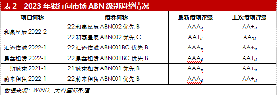 级别调整:2023年,ABN产品涉及评级级别调整项目共5个,未发生产品级别下调或违约。