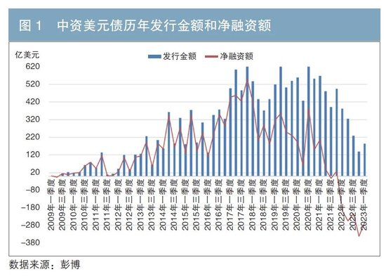 近年来,在离岸市场发行中资美元债成为部分中资企业融资的重要渠道。中资美元债是指中资机构在离岸债券市场发行的以美元计价的债券。2013—2017年是中资美元债的快速发展期,发行规模翻番,特别是2017年发行2291.4亿美元,较2013年、2016年分别增长2.7、0.9倍1。2018年以来,房地产相关领域风险逐渐暴露,为防范外债风险,监管收紧了房企和城投公司发行中资美元债。2023年,外债发行由备案登记制改为审批备案制,发行监管进一步加强。2021年以来,中资美元债发行规模快速下降、净融资转负,2023年净融资额约-700亿美元。截至2023年末,存量规模约8700亿美元,较最高峰时收缩约25%(见图1)。