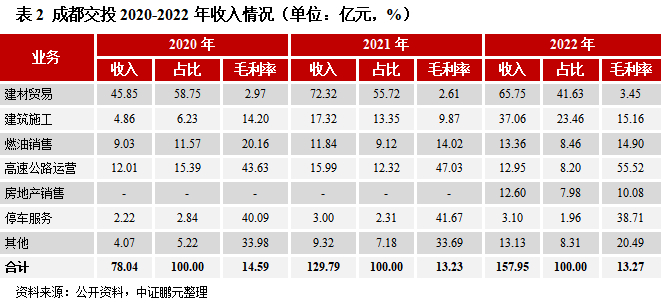 从收入层面来看,2020-2022年成都交投的营业收入呈现出良好的增长态势,且各年度的收入也都主要来源于市场化经营业务(见表2)。其中,第一大主营业务为建材贸易,2020-2022年的平均收入规模为61.31亿元,在营业收入中的占比均值为52.03%,毛利润分别为1.36亿元、1.89亿元、2.27亿元,实现平稳增长;第二大主营业务为建筑施工,与多数城投的工程代建业务不同,成都交投的建筑施工基本实现市场化运作,经营范围为以成都市为主的市政路桥工程建设,以施工总承包为主,也有专业工程承包,2022年收入规模达到37.06亿元,在营业收入中的占比为23.46%,2020-2022年贡献的毛利润分别为0.69亿元、1.71亿元、5.62亿元,增长较快;燃油销售与高速公路运营在营业收入中的占比接近,但后者创造的毛利润远超前者,其对公司利润的贡献连续三年均为各业务板块之首,考虑到公司高速公路运营业务的资金平衡源于通行费收入,虽执行政府定价但整体上与政府的密切程度较低,且不依赖政府补贴,故可将其归为经营性业务;停车服务相关收入虽然在营业收入中的占比较低,但其毛利率始终稳定地保持在40%左右的高水平,能对公司的盈利形成有效补充;房地产销售是2022年新增业务板块,由其子公司善城实业(具备房地产二级开发资质)负责,以商品房开发为主,在建商品房项目和储备土地较多,业务持续性较好;其他业务板块包括房屋租赁、客运、物业管理和服务等,也为公司贡献了一定的收益。综合以上分析,可以确定成都交投满足“总收入中城投类占比低于30%”的要求。
