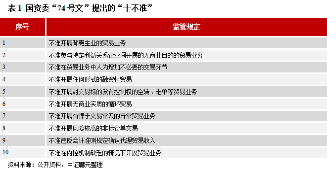 除了继续做大来自于上述三类项目的收入外,还可以通过新增或扩大以下几类收入来实现总收入中城投类占比低于30%:(1)房地产销售收入,主要是商品住宅销售收入;(2)资产租赁收入,包括商铺、写字楼、厂房等的租金;(3)景区门票收入,需提醒的是应避免相关收入归集后上缴地方财政然后再返还给当地城投,否则很可能被认定为财政性现金流;(4)工程施工收入,有别于传统城建业务中的工程代建,是城投公司在具备专业资质的基础上,凭借专业能力获取的市场化业务收入;(5)贸易收入,此类业务能在较短时间内增大城投公司的营业收入、改变城投公司的收入结构,已经成为很多城投公司优化报表的“法宝”,加之监管部门目前不仅将其认定为经营性收入,而且并未对其作剔除处理(实践中有评级机构将城投公司的贸易收入从营业收入中剔除,理由是认为该部分业务只是表面上改善了营业收入的数据,但实际上对利润的贡献很小甚至为负),故各家城投还是可以保持合理的贸易业务规模,只是要注意开展业务的过程中一定避免合规风险。去年12月国资委发布《关于规范中央企业贸易管理严禁各类虚假贸易的通知》(简称“74号文”),针对国企央企开展贸易业务明确提出了“十不准”(见表1),这提醒城投公司一定要确保贸易背景的真实性,不得出于维持自身信用评级、获取外部融资等目的而“无中生有”、“虚假做大”,同时要建立完善的贸易业务内控体系,平衡好安全与发展的关系,此外还应避免开展非标仓单交易等超出自身专业能力范围的高风险业务品类。除了以上五类收入,城投公司还可以通过收购上市公司股权、划入产业类企业(不限于当地国企,还可以考虑民企)股权、整合类金融机构(如小贷、融资租赁、融资担保等)股权等方式来进一步丰富经营性收入类型、扩大经营性收入规模,这些操作见效确实快但蕴含着不同程度的风险,可行性也会受各种客观条件的限制,城投公司在具体实施相关方案时应保持谨慎、思虑周全,此处不再详述。