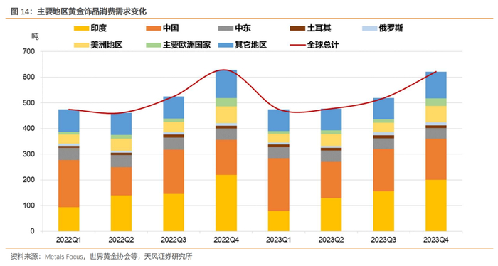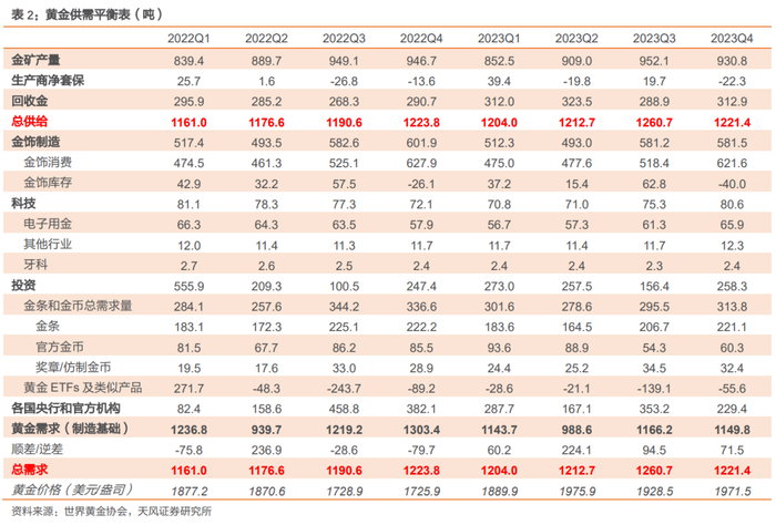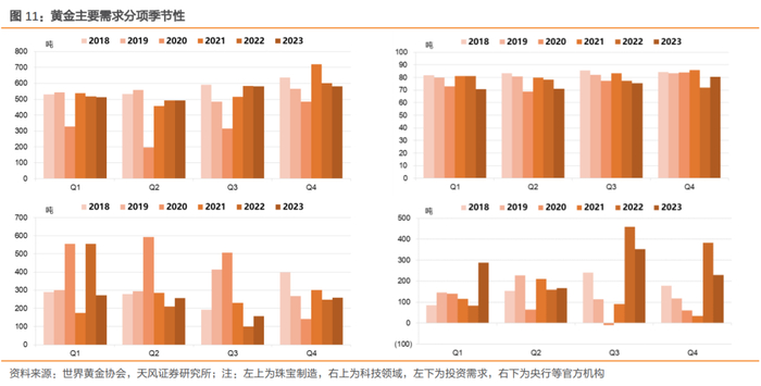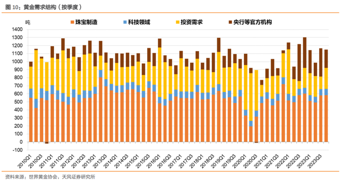 2012-2013年、2020年以后,黄金需求边际增量主要在于珠宝制造;2023年下半年的变化,在于金饰、投资金条、以及央行和官方机构的需求有所增加。