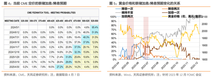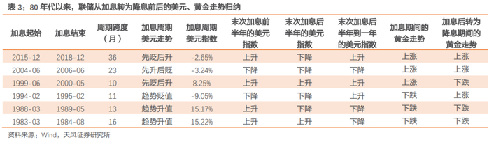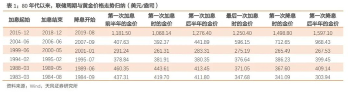 价格角度,观察联邦基金基准利率与黄金价格的走势关系,1980年以来的货币政策周期给出了如下经验性规律: