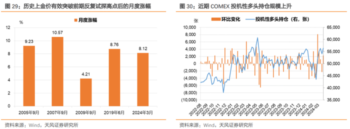 当然,投机力量与技术面因素或也助推金价走强。COMEX投机性多头仓位快速提升,为黄金上涨趋势提供额外动量效应。且观察历史上金价一旦有效突破前期反复试探的阶段性高点,往后的一个月内可能会有较大涨幅。2024年3月突破前,金价已经在前高附近整理了相对较久的时间,3月涨幅与历史水平也基本匹配。
