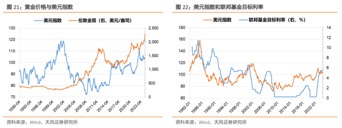 当加息结束后美元指数下跌时,金价上涨的概率较大。比如1995年、2006年加息结束后美元指数下跌,黄金上涨。