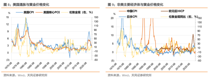 先看主要经济体通胀水平和黄金价格同比变化。观察黄金的通胀保值属性。