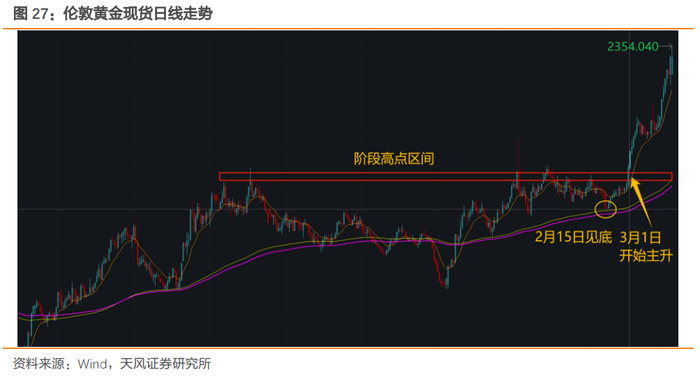 细致观察,本轮黄金行情见底回升的时点是在2月15日前后,突破前期多次试探的阶段高点区间并加速上涨的时点是在3月1日前后。