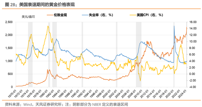 美国经济周期与黄金价格存在联系,参考美国NBER所定义的美国衰退阶段(标准是失业率的快速上行),衰退期间黄金价格大多上涨,滞涨阶段黄金价格表现也往往较好。