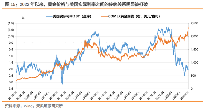 至于2022年之后,上文已详述金价和实际利率的明显背离,此处不再重复。