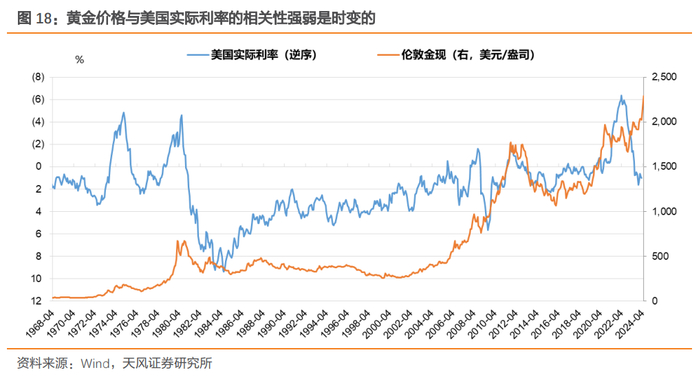 如果仔细观察两者关系,背离的阶段也并不少,比如1970.12-1972.09(实际利率上行,金价上行);1997.05-2001.01(实际利率下行,金价下行);2022.10-2024.04(实际利率上行,金价上行)。