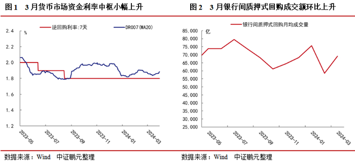 银行间流动性平衡,7天资金利率中枢略高于政策利率,银行间质押式回购成交量环比上升。上旬,央行单日大幅净回笼资金,DR007上升5BP到1.87%;中旬,缴税走款、央行小幅缩量续作MLF等因素对资金扰动有限,资金利率中旬保持平稳。月底,流动性边际趋紧,资金利率明显抬升,但机构总体平稳跨月。3月,资金利率中枢小幅抬升,其中DR001在[1.70,1.78]区间运行,月度均值1.74%,较上月上升4BP;DR007在[1.82,2.01]区间波动,月度均值1.89%,较上月上升3BP,比公开市场7天逆回购利率高9BP。3月,银行间质押式回购日均成交量环比上升17.9%,为6.91万亿,春节假期的影响消退。3月,央行公开市场投放9710亿逆回购、3870亿MLF、国库现金定存800亿元,当月有15220亿元逆回购、4810亿MLF和500亿国库现金定存到期,因此3月公开市场净回笼6150亿元。