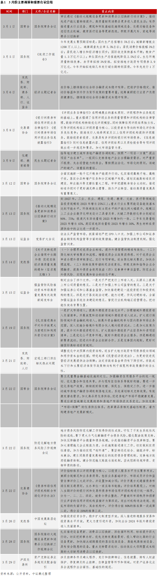 1.顶层设计:(1)《政府工作报告》:3月5日,最新《政府工作报告》将今年发展主要预期目标是:国内生产总值增长5%左右;城镇新增就业1200万人以上,城镇调查失业率5.5%左右;居民消费价格涨幅3%左右;居民收入增长和经济增长同步;国际收支保持基本平衡;粮食产量1.3万亿斤以上;单位国内生产总值能耗降低2.5%左右,生态环境质量持续改善。赤字率拟按3%安排,拟安排地方政府专项债券3.9万亿元。今年开始拟连续几年发行超长期特别国债,今年先发行1万亿元。(2)大规模设备更新和消费品以旧换新:3月1日,国务院常务会议审议通过《推动大规模设备更新和消费品以旧换新行动方案》,推动先进产能比重持续提升,高质量耐用消费品更多进入居民生活;3月13日,国务院发布《推动大规模设备更新和消费品以旧换新行动方案》,到2027年,工业、农业、建筑、交通、教育、文旅、医疗等领域设备投资规模较2023年增长25%以上;3月28日,国务院推动大规模设备更新和消费品以旧换新工作视频会议表示,扎实推进设备更新、消费品以旧换新、回收循环利用、标准提升四大行动。