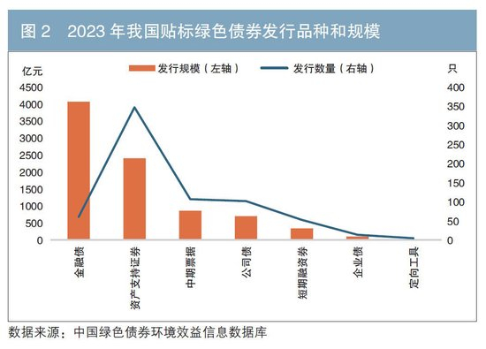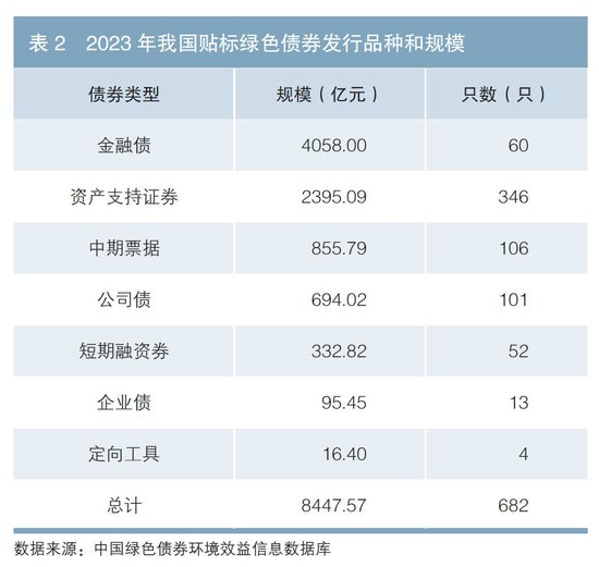 聚焦到贴标绿色债券,整体规模较上年出现小幅回落,但总量仍超过8000亿元。2023年,境内共发行贴标绿色债券682只,发行金额合计8448亿元,约占“投向绿”规模的50.42%(见表2)。其中,领跑发行规模的债券品种依次为绿色金融债券、资产支持证券和中期票据,发行金额分别为4058亿元、2395亿元、856亿元(见图2)。