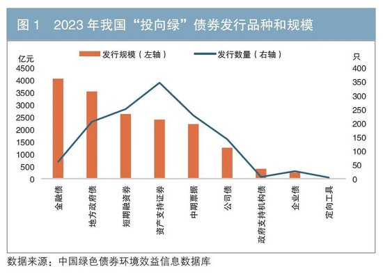 2023年,我国发行的“投向绿”债券规模同比略有下降,但仍保持较高水平。总体发行规模达到1.68万亿元(见表1),较上年下降约900亿元;发行只数为1269只,较上年增加4只。债券类型分布中,与上年不同的是,金融债总体发行规模超过了地方政府债,达到4058亿元(见图1),占比最高。资产支持证券发行只数最多,对应发行规模为2395亿元。