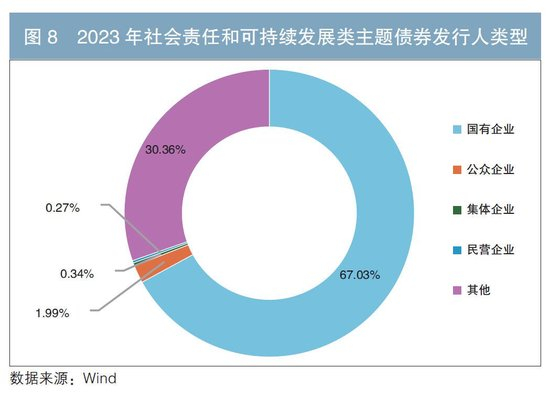 现阶段,我国社会责任债券与可持续发展债券市场仍处于初级阶段,但已涌现出多种相关主题债券,如区域发展债、纾困专项债等。根据万得(Wind)数据,2023年我国发行此类主题债券9约184只,规模为1167亿元。其中,区域发展债券是这类主题债券的主要组成部分,发行规模占比超过90%(见图6)。从债券品种来看,主要集中于公司债券,发行规模占比为35.68%(见图7)。发行主体中,国有企业为此类主题债券发行的主力军,2023年发行相关主题债券规模占比约为67.03%(见图8)。
