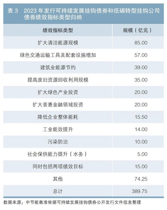 2023年,可持续发展挂钩债券和低碳转型挂钩公司债券发行55只,规模约为390亿元(见表3)。这些挂钩债券对于具体投向没有限制,主要是将债券条款与发行人可持续发展、低碳转型相关绩效进行挂钩。从统计结果来看,2023年覆盖这两类挂钩债券发行规模最大的绩效指标为扩大清洁能源规模,与2022年统计结果一致。但相较上年新增了绿色交通运输工具及配套设施增加(如充电桩等)、提高废旧资源回收利用规模、社会保供能力提升类别。