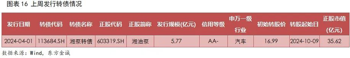 上周,湘泵转债发行5.77亿元,无转债上市,截至上周五,转债市场存量规模8032.41亿元,相较前周开始回升,较年初减少669.58亿元。湘泵转债发行人湖南机油泵股份有限公司是一家节能与新能源汽车零部件制造企业,公司产品已涵盖了发动机及车用泵类产品,传动装置,精密成型,电机,智能装备,电子助力转向系统/电子控制单元,新能源线控产品等,从单品种小产品到产品单元化/模块化,从传统泵到新能源电动泵,实现了机-电-智能产品全覆盖。