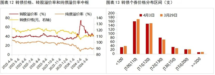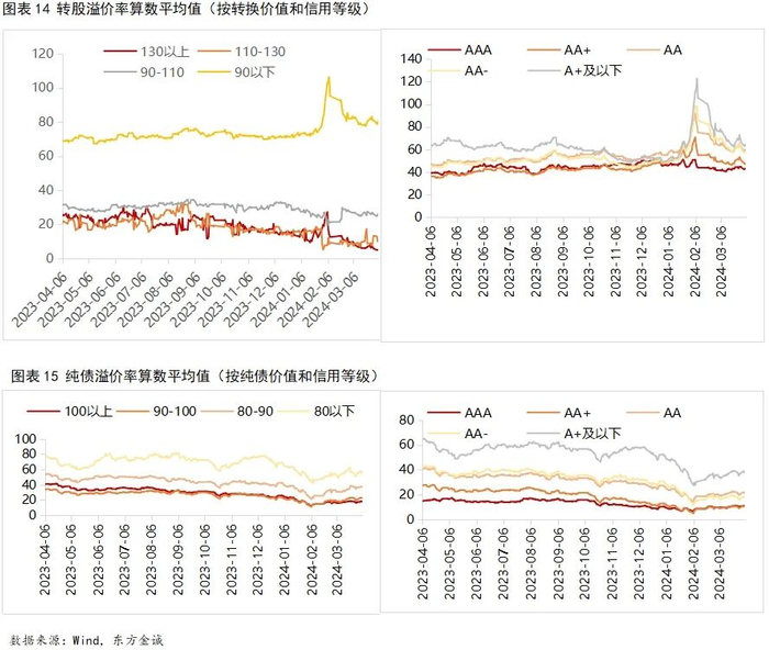 上周,转债市场价格回落,估值抬升。转债价格方面,上周,全市场转债价格算术平均值和中位数分别为119.67元、112.60元,相比前周上升1.41元、2.14元,主要为120元以上转债数量增加所致。转股溢价率方面,上周,全市场转债转股溢价率算术平均值和中位数分别为57.80%、42.21%,较上周下降6.78pcts、4.54pcts,其中,转股价值90以下转债转股溢价率算术平均值下降2.80pcts,信用评级A+及以下转债转股溢价率算术平均值下降8.43pcts;纯债溢价率方面,全市场纯债溢价率算数平均值和中位数分别为22.98%和13.81%,较前周上升2.00pcts和1.88pcts,其中,纯债价值80以下转债纯债溢价率上升3.71pcts,A+及以下转债的纯债溢价率上升2.27pcts。