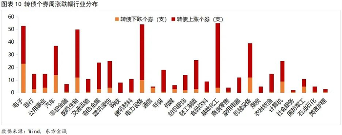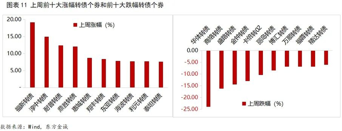 条款跟踪方面,多只转债公告将提前赎回。上周,东亚转债公告将转股价格由24.95元/股下修至20.60元/股;密卫转债、盟升转债公告董事会提议下修转股价格;长集转债、富瀚转债、维尔转债、上声转债、科顺转债、回盛转债公告不下修转股价格;金埔转债、好客转债、水羊转债公告预计触发下修条件。上周,贵轮转债、商络转债公告将提前赎回。