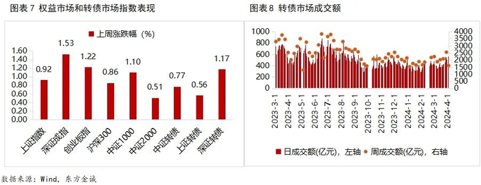 市场回顾:上周,转债市场跟随权益市场震荡反弹,价格上升,估值压降;一级市场湘泵转债发行,发行规模5.77亿元,无转债上市;截至上周五,转债市场存量规模8032.41亿元,较年初减少669.58亿元。