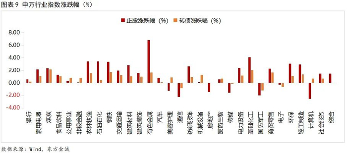 上周,转债市场主要指数震荡上行,中证转债、上证转债、深证转债指数分别收涨0.77%、0.56%、1.17%,日均成交额535.17亿元,较上周继续放量25.25亿元。从价格看,转债市场大多个券上涨,564支转债中439只个券上涨,125支个券下跌,上涨个券主要以基础化工、电力设备、医药生物居多,下跌个券主要以电子、汽车、机械设备为主。从上涨个券看,福新转债涨超19%,淳中转债涨超14%,耐普转债、鼎盛转债涨超12%;下跌转债中,华体转债跌逾23%,商络转债跌逾16%,盛路转债跌逾14%,金钟转债跌逾12%。