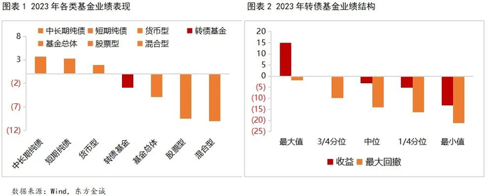 2023年,经济基本面修复不及预期,资本市场呈现股弱债强格局,根据2023年度基金年报披露数据显示,转债基金以平均-2.89%的年度收益,跑赢基金总体收益,以及股票型、混合型基金收益,但表现不及纯债与货币型基金。结构上看,截至2023年末,市场存量72支转债基金(选取同花顺口径)中仅五分之一实现正收益,转债基金年度回报率中位数-3.18%,中位最大回撤达到-14.12%,整体波动较大。同时,72只转债基金业绩分化明显,其中工银可转债年度回报率15.06%,高居榜首,而工银可转债优选C以-13.13%的回报率垫底。