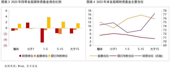 2023年四季度,伴随权益与转债市场持续调整,转债基金转债仓位平均74.51%,相比三季度末降低0.68pcts,股票仓位12.04%,降低0.71pcts,而银行存款增持1.42pcts达到5.19%,风险偏好进一步降低。分规模看,规模1亿元以下转债基金风险偏好最低,股票仓位最低(9.14%),银行存款仓位最高(6.22%),较前期变化不大,转债仓位上升1.94pcts,至整体均值附近(74.89%),是四季度唯一增持转债的规模类别;其余规模转债基金四季度均不同程度减持权益与转债仓位,增持银行存款,其中规模1-15亿规模转债基金的转债仓位2023年末降至72%附近,15亿规模以上转债基金的转债仓位降至77%左右。