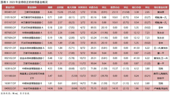 2023年,转债基金以-2.89%的平均年度收益,跑赢股票型、混合型基金,但跑输纯债与货币型基金,72支存量转债基金中仅15支实现年度正收益,业绩分化明显。2023年四季度,转债基金风险偏好随市场调整进一步下行,大幅增持银行存款,降低转债与股票仓位,提升组合防御属性,成为转债基金控制回撤的重要手段。